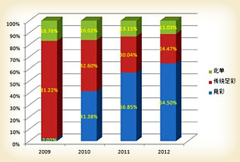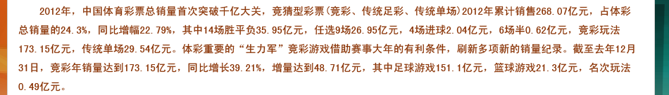 2012年传统足彩中,14场胜平负35.95亿元,任选9场26.95亿元,4场进球2.04亿元,6场半0.62亿元,传统单场29.54亿元。