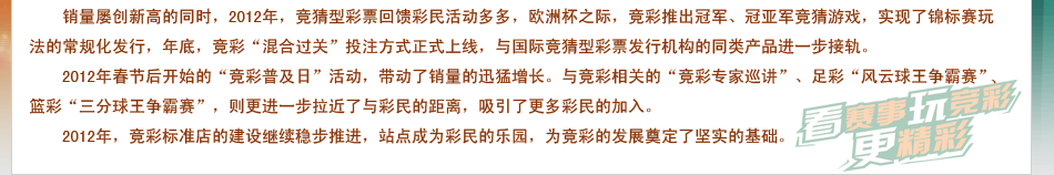 2012年是赛事大年,丰富的足、篮球赛事资源为竞彩的销售市场提供了有力的基础性保障。2012年春节后开始的“竞彩普及日”活动,带来了竞彩开年以来的第一个高峰期, 自2月初开始,竞彩推出提高固定奖金、降低玩法难度等措施;3月1日起,竞彩“足球胜平负游戏”取消大部分比赛的让球,大大提高中奖率,吸引了大批新彩民参与其中。“普及日活动”带动了竞彩销量的迅猛增长,据统计,2012年3月~5月竞彩的总销量达到52.8亿元,其实4月份一个月内创造了日销量1.19亿元和月销量20.5亿元两项新纪录,在竞彩历史上写下浓墨重彩的一笔。